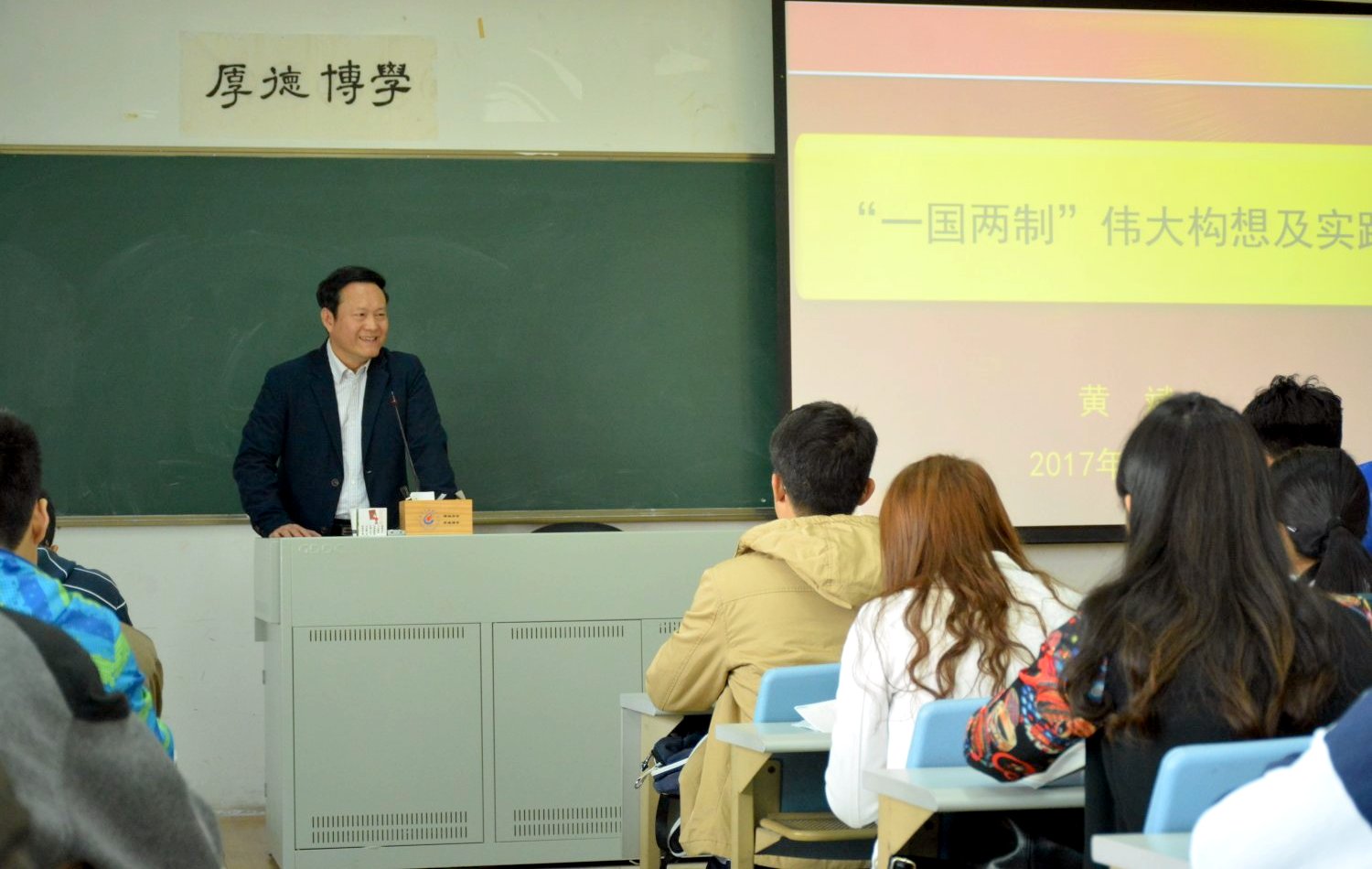 围绕“‘一国两制’伟大构想及实践”主题,黄斌主要讲述了“和平统一、一国两制”构想的形成和发展,基本内容和重要意义,以及“一国两制”构想在香港、澳门的成功实践。