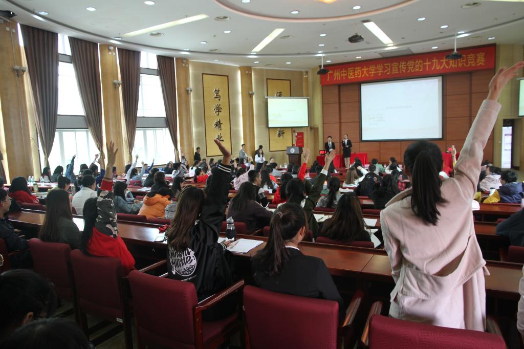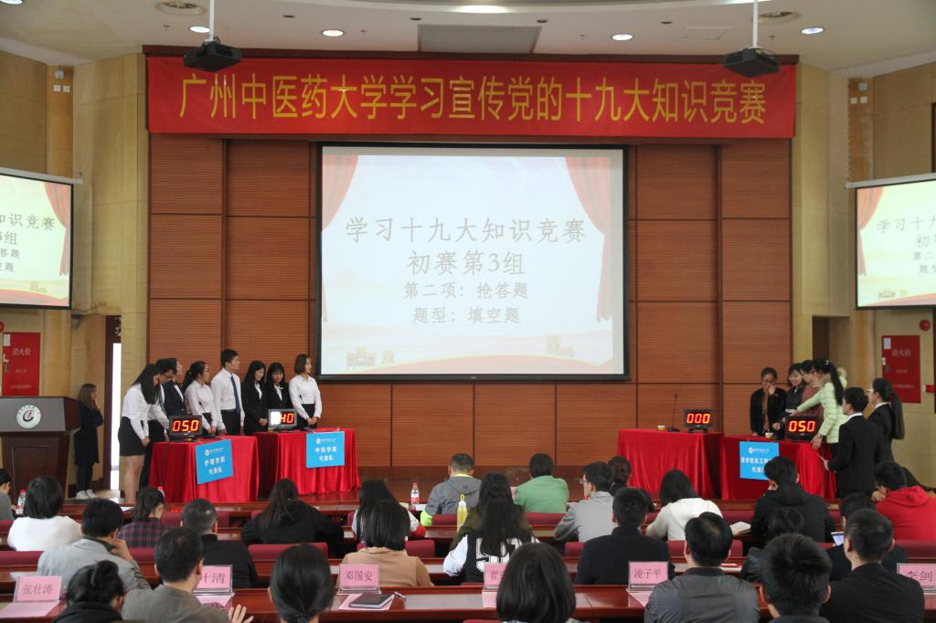 12月12日,学校学习宣传党的十九大知识竞赛在大学城校区举行。来自经济与管理学院、中药学院等12个学院以及研究生院共39名学生参加了竞赛,最终,经济与管理学院摘得桂冠。学校党委副书记翟理祥和组织部、宣传部、学工部、团委、研究生院等负责人以及各学院师生代表共同观看了精彩赛事。