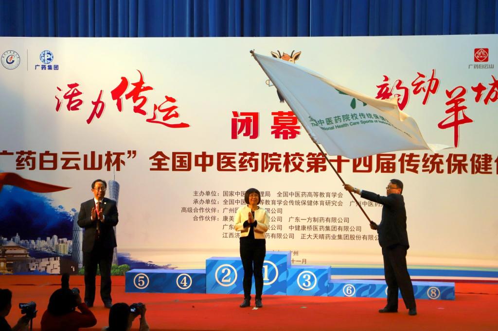 11月23日下午,全国中医药院校第十四届“广药白云山杯”传统保健体育运动会在我校大学城校区闭幕。国家中医药管理局人事教育司副司长张欣霞出席闭幕式。我校副校长林彬主持闭幕式,党委副书记翟理祥、副校长潘华峰为获奖单位和个人颁奖。