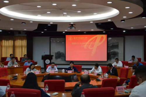 11月19日下午,学校党委在大学城校区办公楼101会议室召开党委理论学习中心组(扩大)学习会,传达学习党的十九届四中全会精神,学校党委书记张建华主持会议并传达了省委有关工作部署和要求。学校党委理论学习中心组成员、管理部门负责人和二级单位党政负责人56人参加了学习。