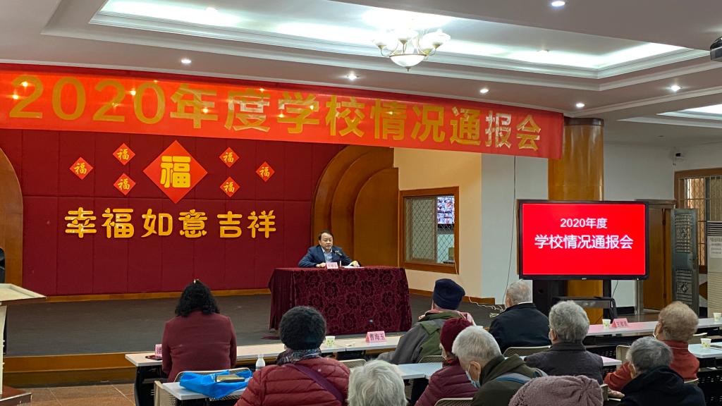 1月14日上午,校长王省良在三元里校区离退休职工活动中心二楼大厅向离退休教职工通报2020年我校各项工作情况。原校领导王绵宁、黄朝阳、冯新送、丘和明、孙晓生,离休老同志曹海玉等100余人参加。副校长潘华峰主持会议。