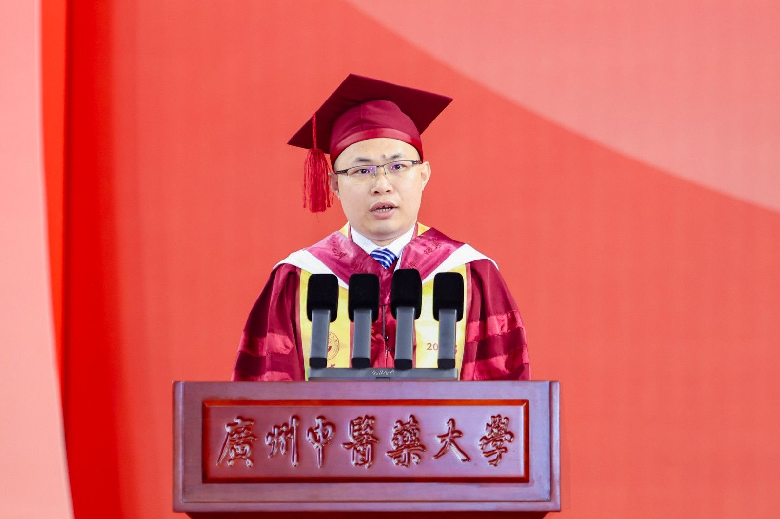学校党委书记陈文锋在致辞中勉励学子,一要心怀“国之大者”,展现青春担当,秉承母校厚重的家国情怀,践行“厚德博学 精诚济世”的校训精神,在为群众解除病痛、守护健康中,在为百姓解决“急难愁盼”、让党的好政策走进千家万户中,努力把人民对美好生活的向往变为可感可知的点滴现实;二要正确对待成败得失,顺境逆境都是人生的财富,要以坚毅不拔传承发展中医药事业的前辈为榜样,勇敢面对困难,跨越人生道路上的每一道坎坷,使人生获得升华和超越;三要让青春在中医药发展的春天更加闪闪发光,中医药正以前所未有的姿态走向世界,作为广中医新百年的首届毕业生,同学们要以实际行动扎根中医药沃土,让中医药成为既是中华民族的健康文化自觉,也是世界各国人民健康守护的重要力量;四要怀揣母校的嘱托逐梦前行启新程,常怀感恩之心,感恩父母的养育之恩、感恩老师的教导之恩、更感恩我们身处的伟大时代。听党话、感党恩、跟党走脚踏实地、展翅高飞!