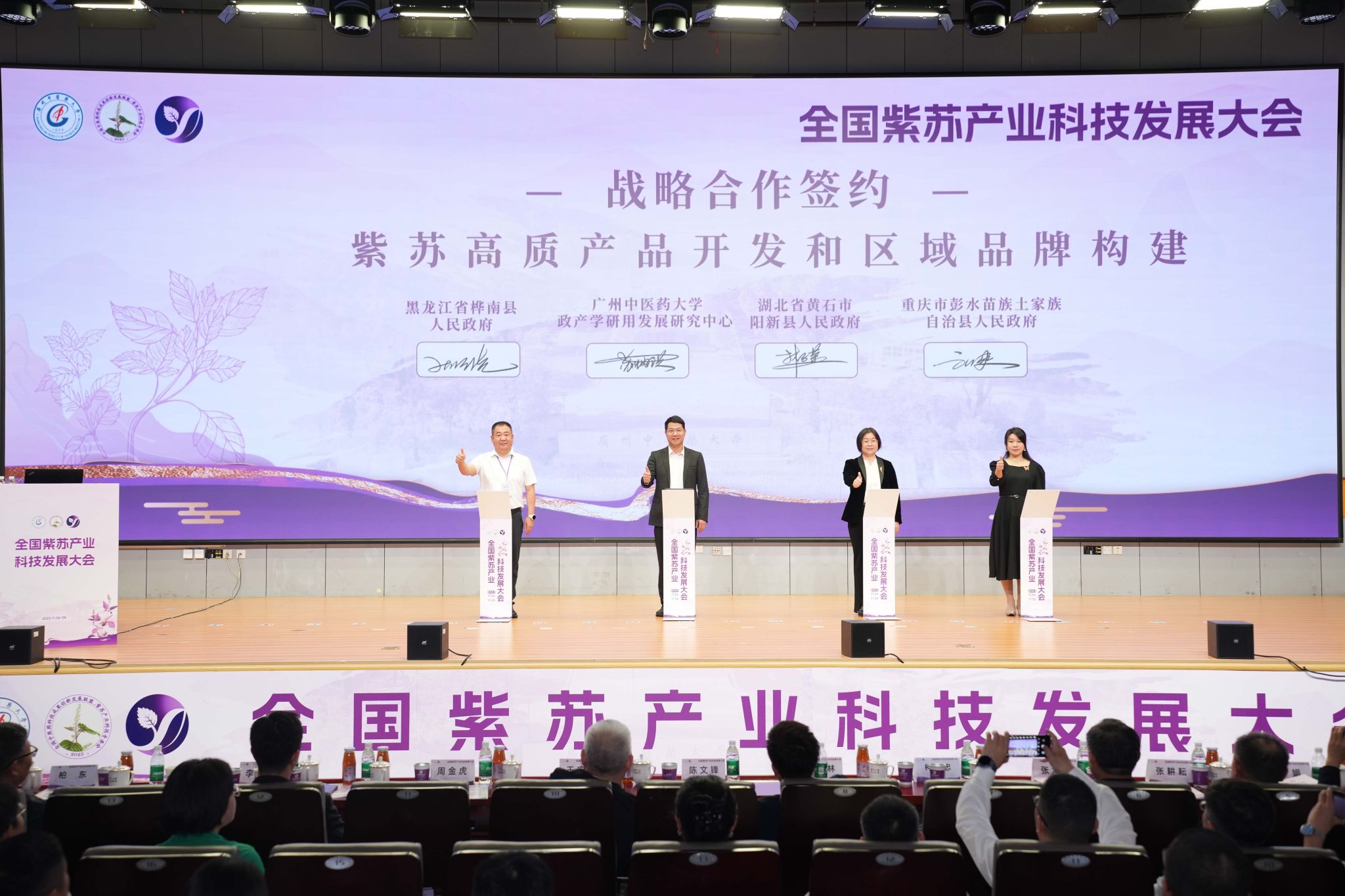大会现场硕果累累,10项合作签约项目涵盖紫苏高值产品开发、区域公共品牌构建、深加工核心技术合作、科研联合攻关等多个关键领域。william威廉中文官网与湖北阳新、黑龙江桦南、重庆彭水等主产区政府达成校地战略合作,多家龙头企业与科研机构开展紫苏功效物质高效提取、国际化产品培育等联合攻关,标志着以紫苏产业为纽带,以教育链为基础、人才链为核心、创新链为动力、产业链为载体的“四链”融合体系初显实效,共同筑造高质量发展新生态。