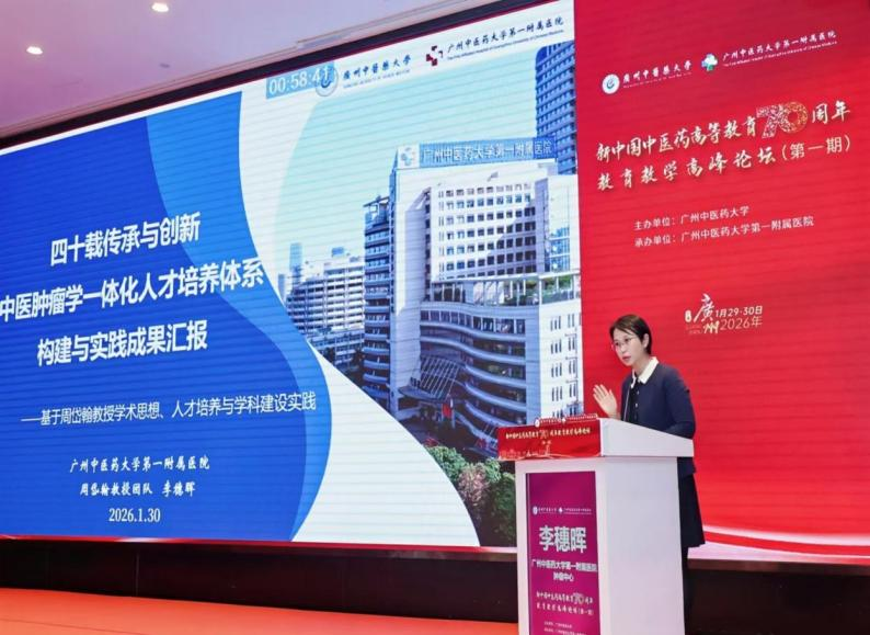 第一附属医院肿瘤中心李穗晖主任医师汇报了中医肿瘤学一体化人才培养体系构建与实践成果,系统回顾了国医大师周岱翰教授作为中医肿瘤教育先行者,四十年来引领学科从无到有、从优到强的完整历程。汇报重点阐释了以“临床奠基、教育开创、科研转化、国际传播”为支柱的医教研协同发展模式,展现了中医肿瘤学科在医疗、教学、科研全方位深度融合中所形成的系统性育人机制与学科生态。