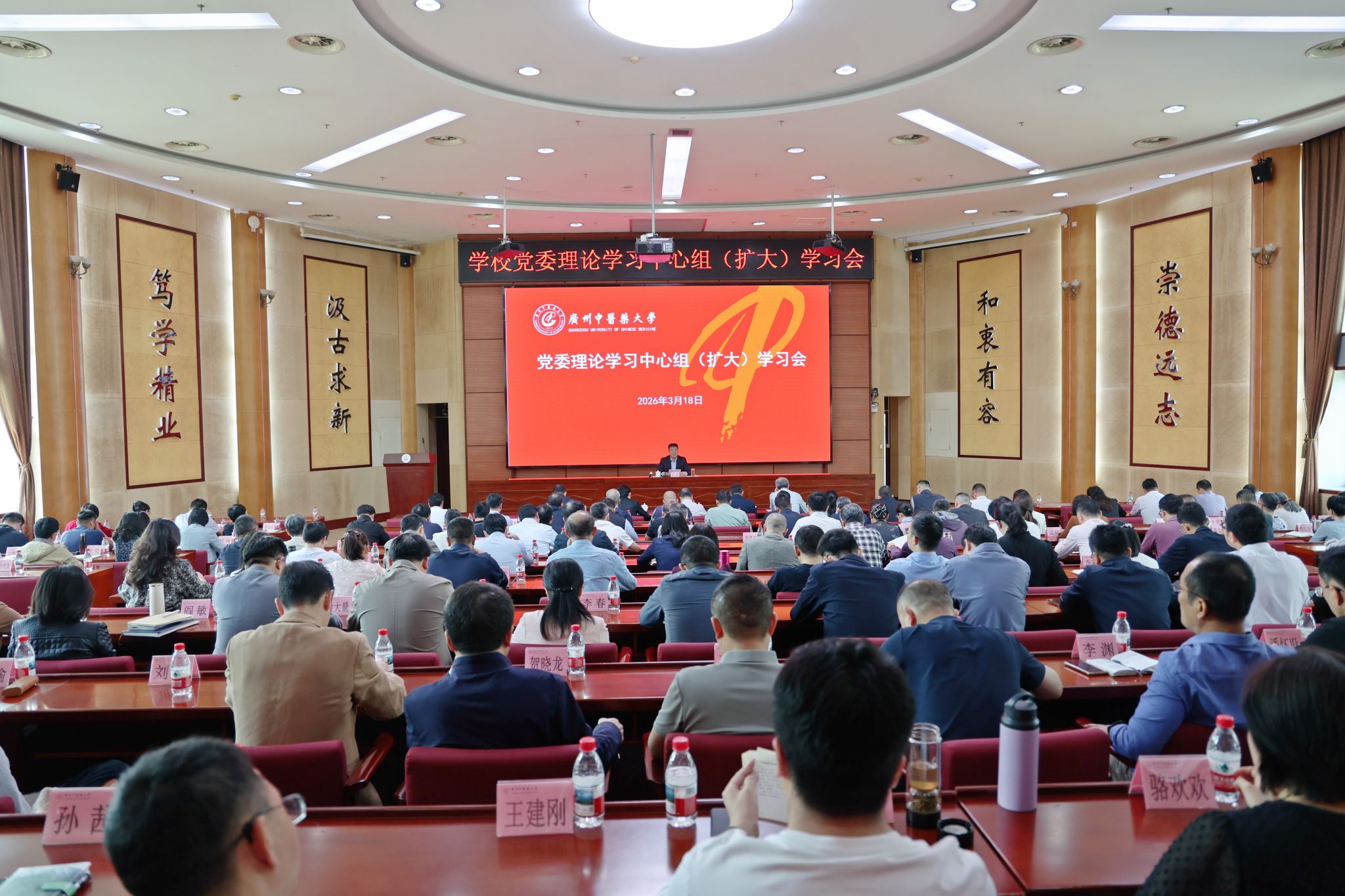 会议要求,学校党委在“十五五”规划编制中,提出“再造一个新广中医”总要求,和2030、2035、2050“三步走”工作设想,全体教职员工要凝心聚力,狠抓落实,按照学校高质量发展大会上的工作部署和学校党委印发的2026年工作要点,全力完成年度各项重点目标任务,确保学校“十五五”发展“开门红”“全年胜”。一是要从严从实开展树立和践行正确政绩观学习教育。二是推进新时代立德树人工程落地见效,进一步提升人才培养质效。三是持续做好科技和产业融合文章,催生转化中医药新质生产力。四是锚定高质量攻坚突破,推动重点工作落地见效。五是办好纪念邓铁涛诞辰110周年系列活动。