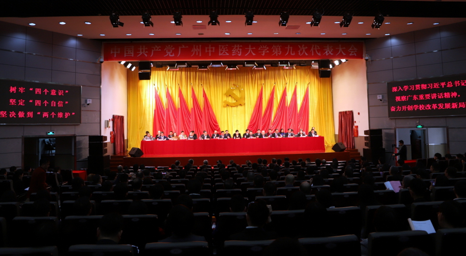 大会的主题是:高举中国特色社会主义伟大旗帜,以习近平新时代中国特色社会主义思想和党的十九大精神统领一切工作,全面贯彻全国教育大会精神和习近平总书记视察广东重要讲话精神,落实立德树人根本任务,坚持改革兴校、质量立校、人才强校理念,凝心聚力谋发展,继往开来绘蓝图,新时代、新担当、新作为,为建设“中国特色、世界一流”的中医药大学而不懈奋斗!
