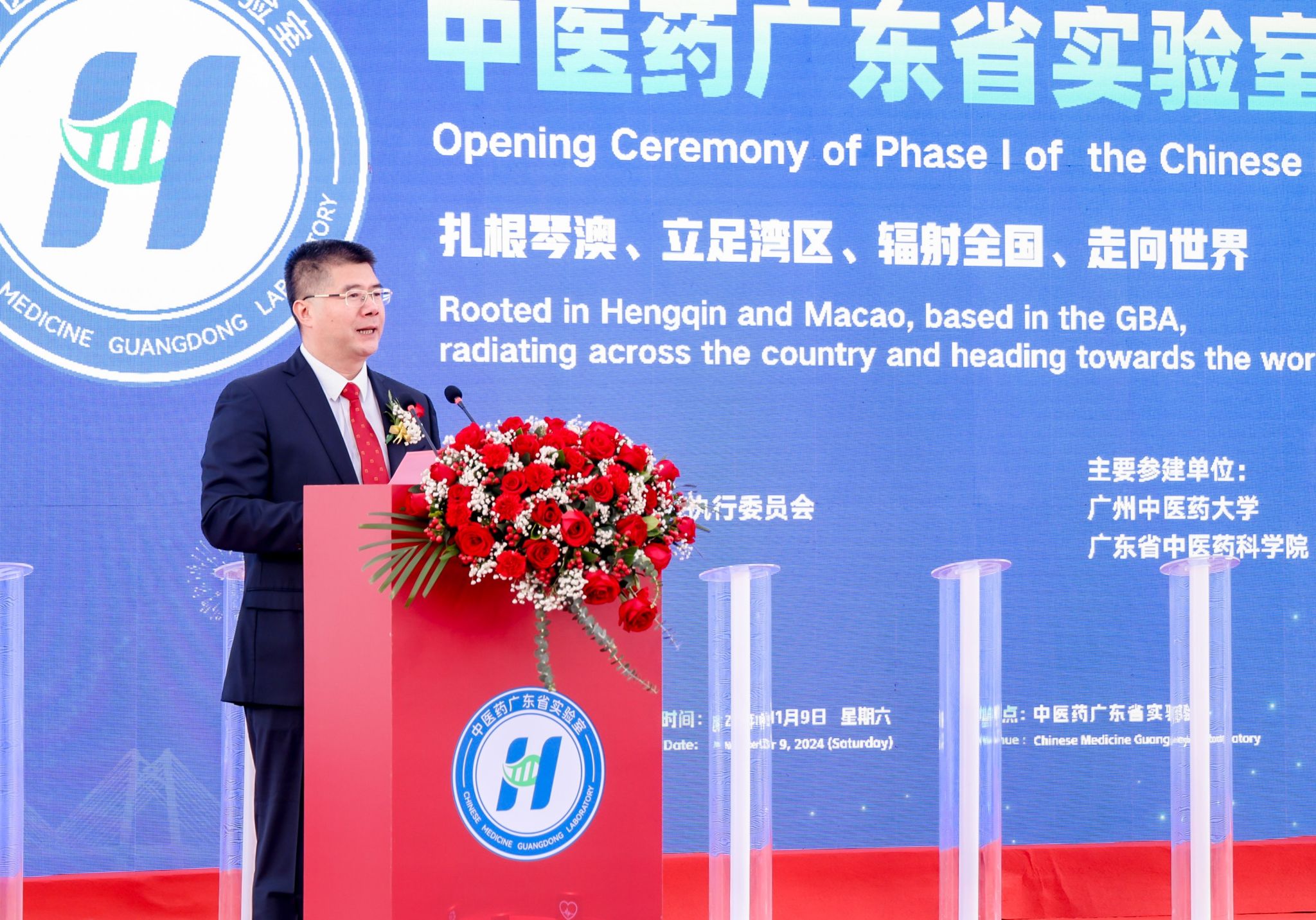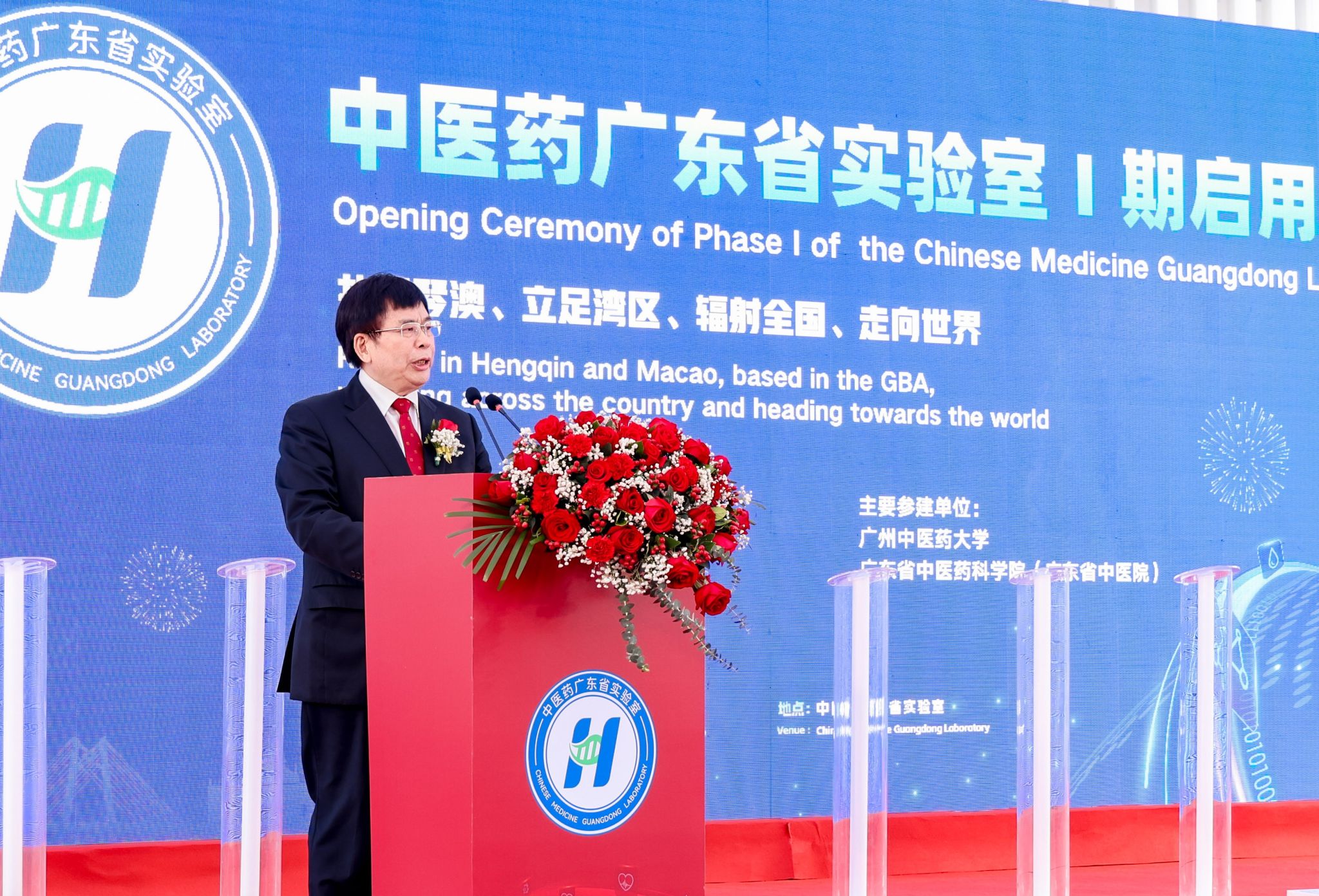 11月9日,中医药广东省实验室(简称“横琴实验室”)Ⅰ期启用仪式在广东横琴粤澳深度合作区顺利举行。国家卫生健康委党组成员、国家中医药管理局党组书记、局长余艳红,广东省委常委张国智,澳门特区政府经济财政司司长、横琴粤澳深度合作区执委会主任李伟农,中国工程院院士、横琴实验室主任、中医证候全国重点实验室主任刘良,中国太平保险集团董事长王思东,中央人民政府驻澳门特区联络办公室经济部部长刘德成,珠海市委副书记、市长黄志豪,广东省政府横琴办主任、横琴粤澳深度合作区执委会副主任聂新平,广东省人民政府副秘书长郭亦乐,广东省卫生健康委党组书记刘利群,广东省科技厅副厅长吴世文,横琴粤澳深度合作区执委会副主任符永革、苏崑,第十三届全国政协常委、澳门科技大学校监廖泽云,william威廉中文官网党委书记陈文锋,澳门特别行政区经济财政司办公室主任辜美玲,国家中医药管理局国际合作司司长吴振斗,广东省中医药局副局长柯忠,广东省中医药科学院(广东省中医院)党委书记史俏蓉,以及来自高校、医院、企业、科研合作团队等相关单位负责人参加仪式。仪式由横琴实验室副主任周华主持。
